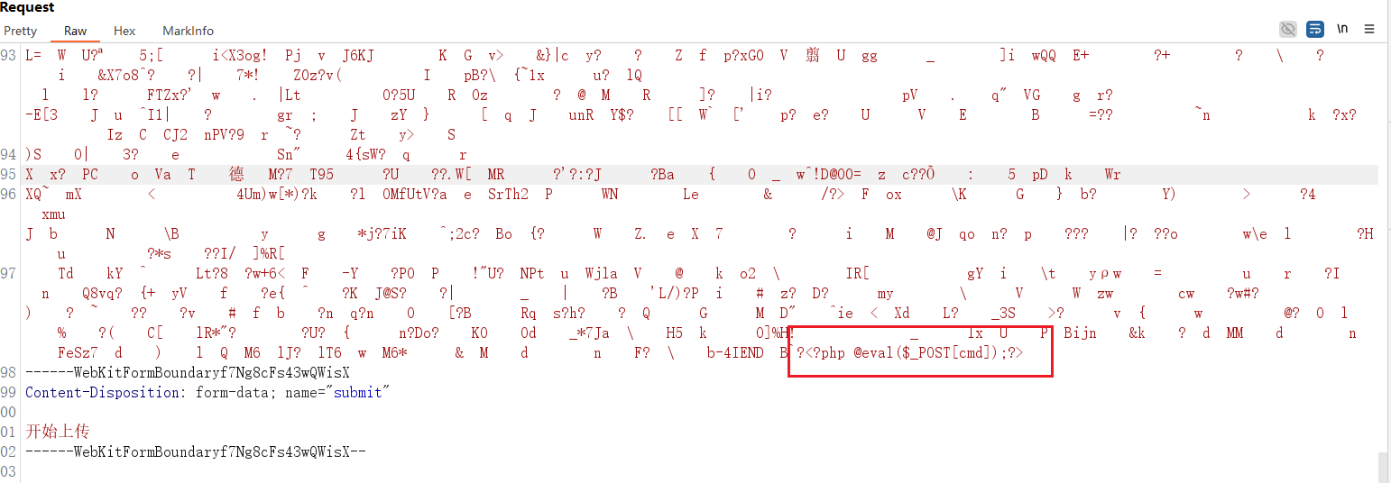 在上传图片,使用 burpsuite 抓包,可以看到一句话木马代码内容