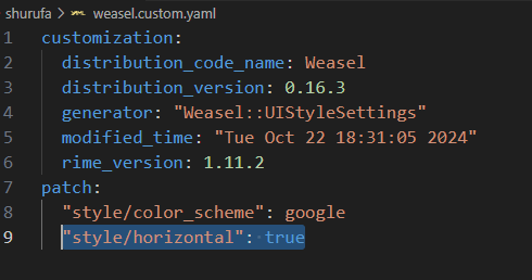 打开 weasel.custom.yaml 文件,在 patch 中添加如下内容