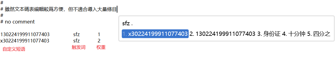 在用户的配置目录下新建文件:custom_phrase.txt。填写以下内容
