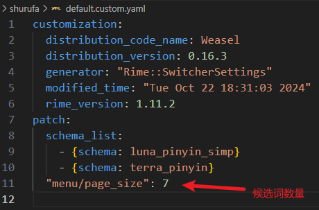 打开 default.custom.yaml 文件,在patch下增加一个空白处,注意前面空两格,添加 "menu/page_size": 7