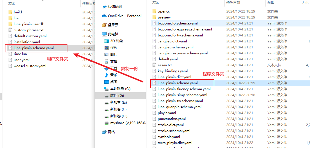 经过测试:复制后,以用户目录下的 schema.yaml 文件为主,我把程序目录的 schema.yaml 文件删掉也没出问题。但不建议删。