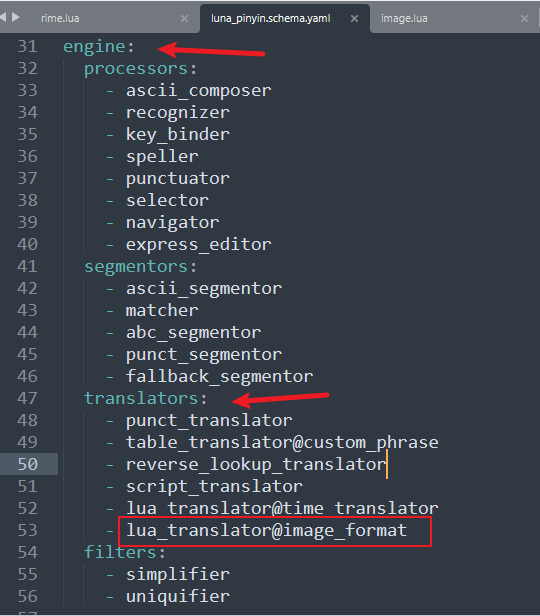 4)打开我们复制到用户目录下的 luna_pinyin.schema.yaml 文件。找到 engine 下的 translators,然后添加 - lua_translator@image_format。如下图所示
