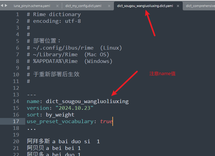 将词库文件准备好,例如:dict_sougou_wangluoliuxing.dict.yaml。在开头写入如下内容,注意 name 值必须和文件名 .dict.yaml 前面的部分保持一致。