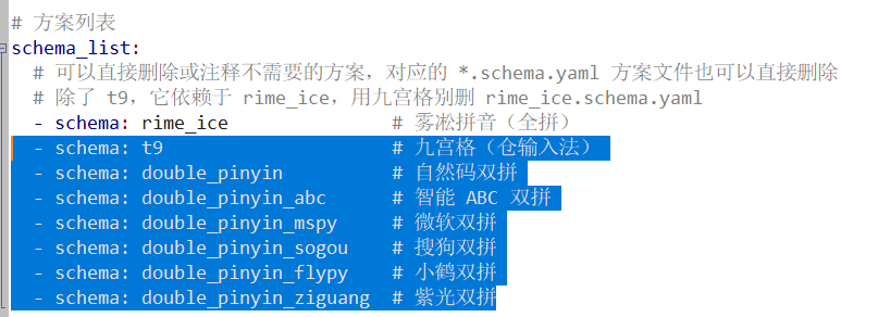 这里我自己做了一些修改,将 default.yaml 文件里面除了雾凇拼音以外的输入法全部注释掉了,因为我用不到。同时修改了快捷键,候选词次数等,这个文档里面有很明了的注释,就不多介绍了。