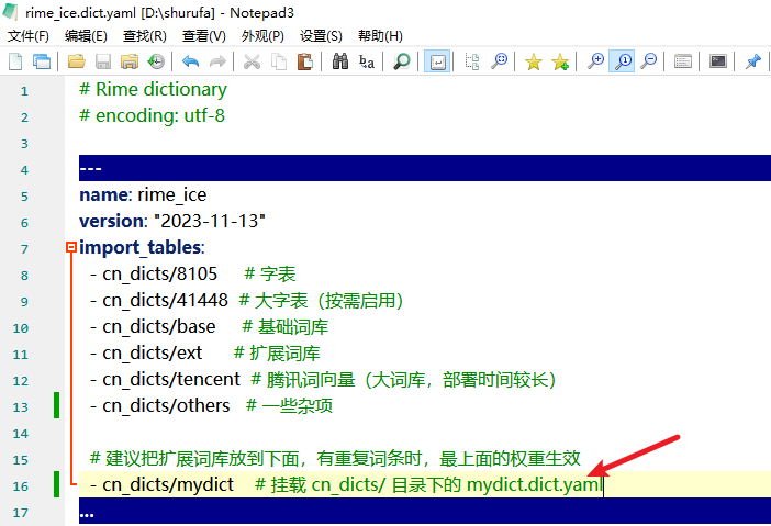 打开 rime_ice.dict.yaml 文件,将创建好的词库文件挂载。注意文件的位置。