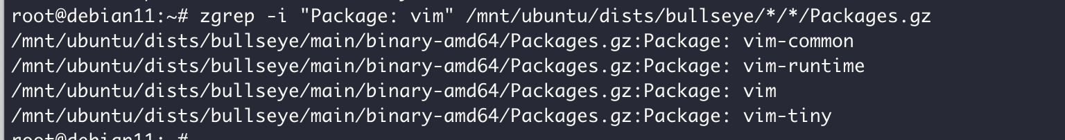 zgrep -i "Package: vim" /mnt/ubuntu/dists/bullseye/*/*/Packages.gz