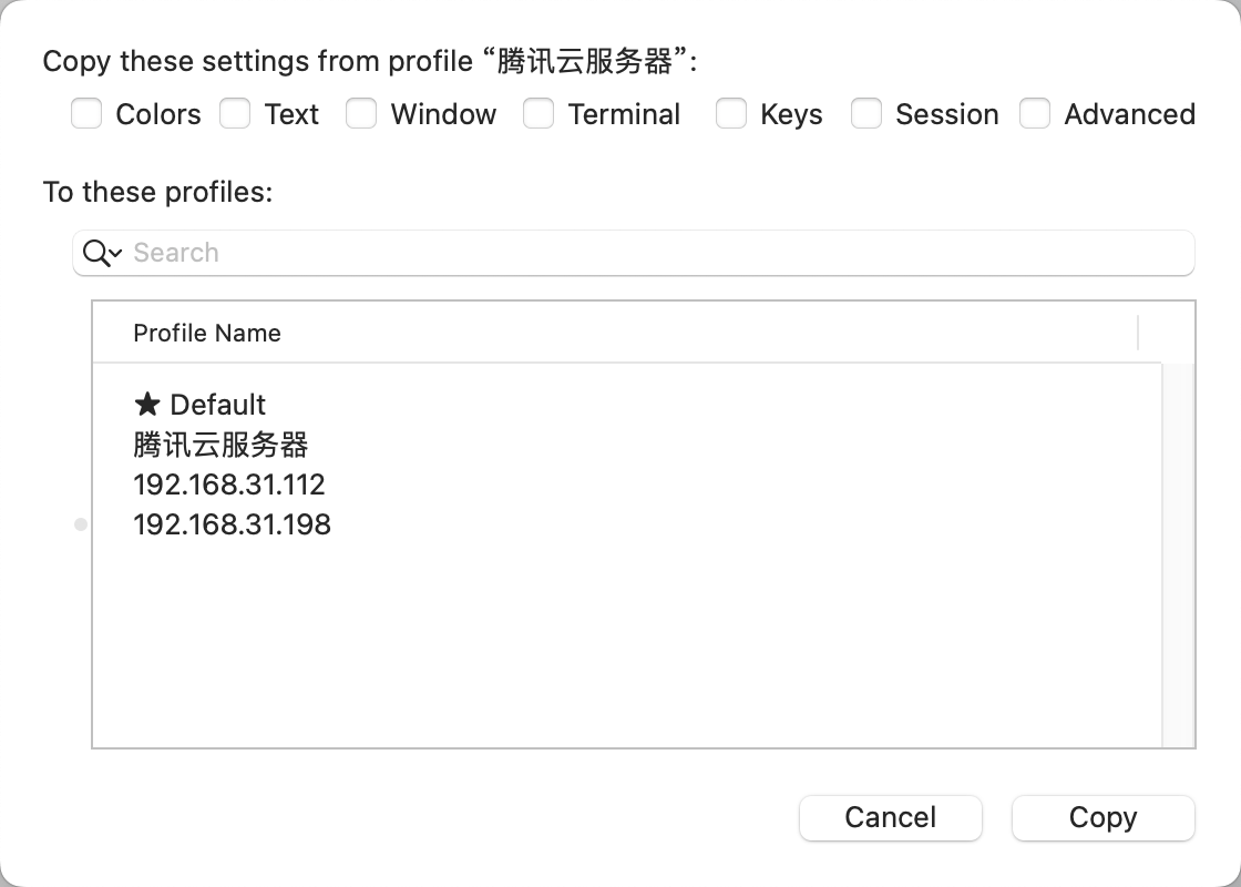 将某个 profile 配置应用到其它 profile 上面。免得一个一个配置。选择一个 profile,点击下方的这个选项
