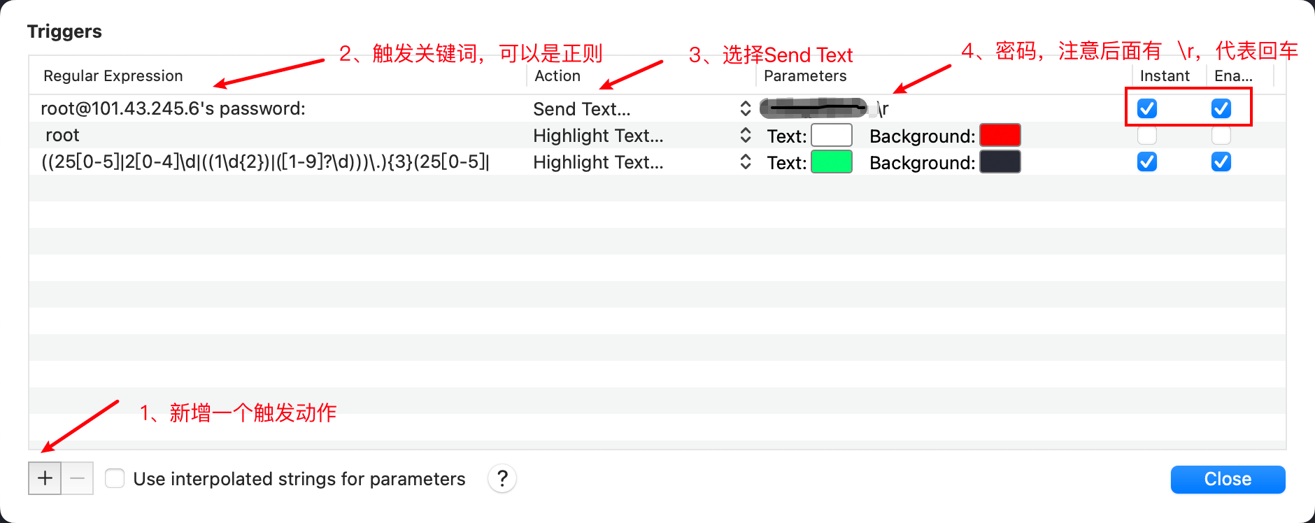 添加两条 trigger,分别设置 Regular expression,Action,Parameters,Instant 如下:
