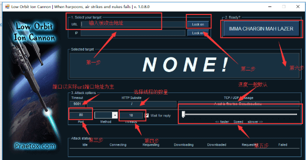 LOIC 是一款专著于 web 应用程序的 Dos/DDOS 攻击工具,它可以用 TCP 数据包、UDP 数据包、HTTP 请求于对目标网站进行 DDOS/DOS 测试,不怀好意的人可能利用 LOIC 构建僵尸网络。下载地址: https://sourceforge.net/projects/loic/