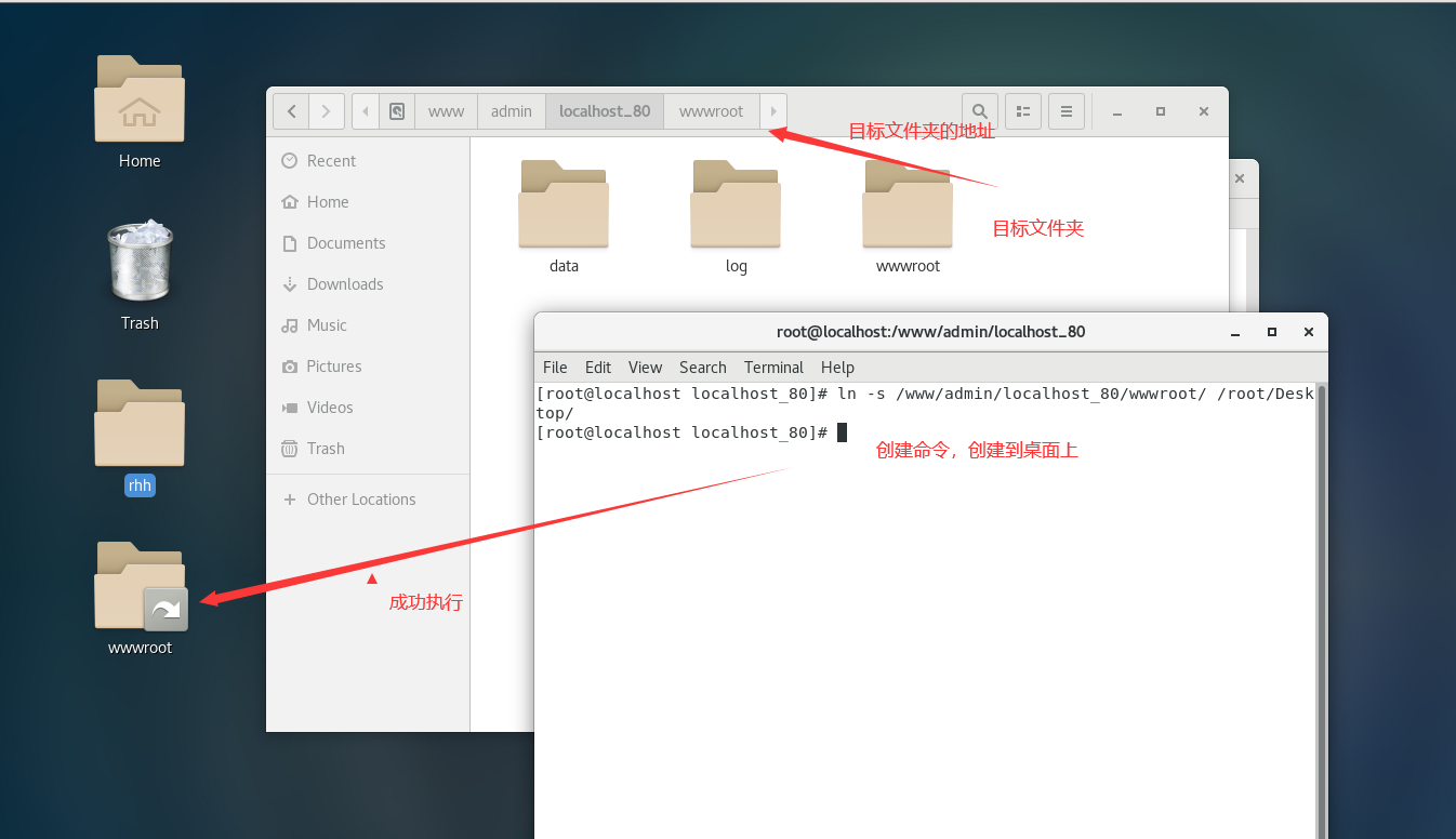 例如:ln -s /www/admin/localhost_80/wwwroot/ /root/Desktop/