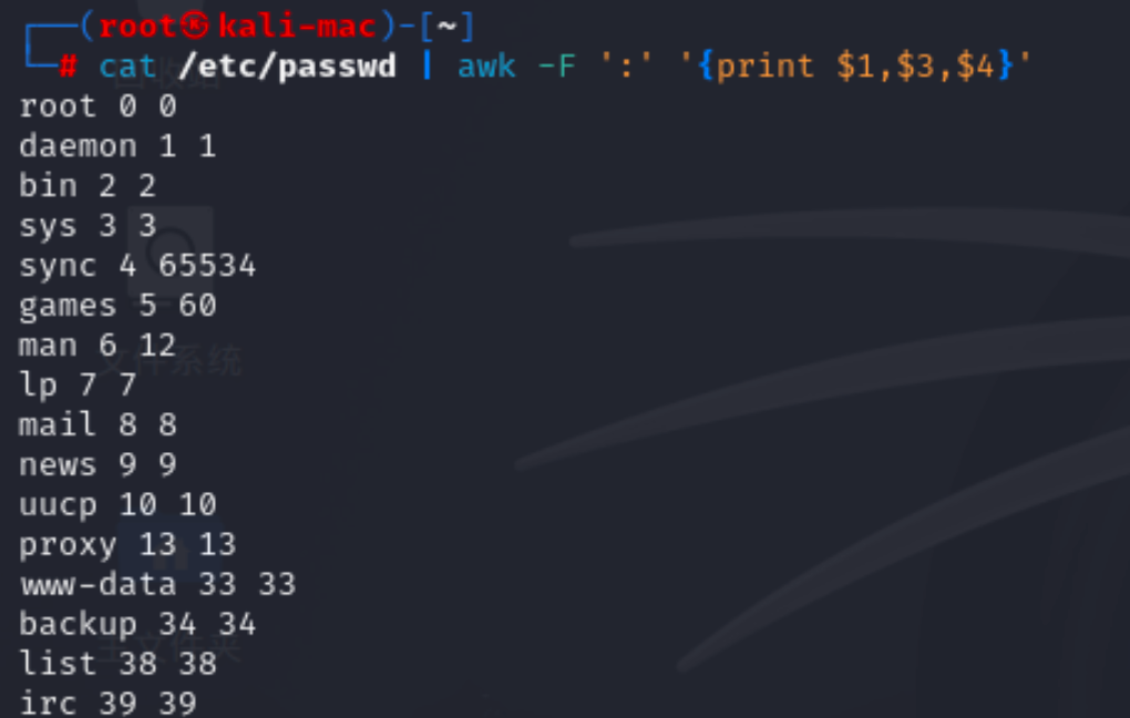 cat /etc/passwd | awk -F ':' '{print $1,$3,$4}'