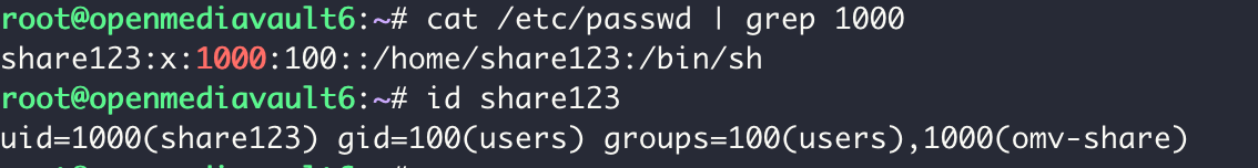退出容器返回宿主机,查看 passwd 文件,查找 uid 为 1000 的用户。可以看到用户名为 share 123。使用 id 命令进行查看,它的 uid 为 1000,gid 为 100,表示当前工作组是 users, 其中 share 123 既是 users 组,又是 omv-share 组。