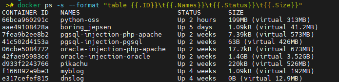 # --format "table {{.ID}}\t{{.Names}}\t{{.Status}}\t{{.Size}}",格式化输出
