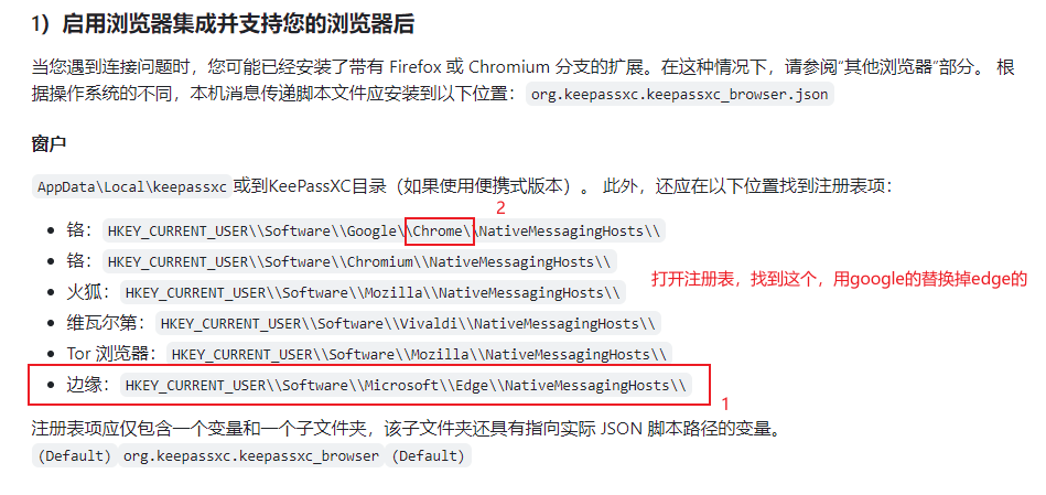 edge 浏览器,笔记本的没问题,主机连接失败,秘钥交换失败。可能是秘钥配置文件问题,就用老版本的 KeePassXC。需要替换掉不能用的 json 文件。用 google 的可以